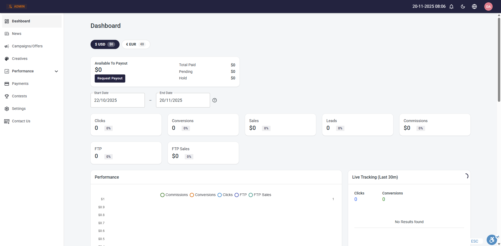 Affiliates that participate in multiple campaigns that have different campaign currencies will see multiple balances for each currency and they will be able to request a payout for each balance.