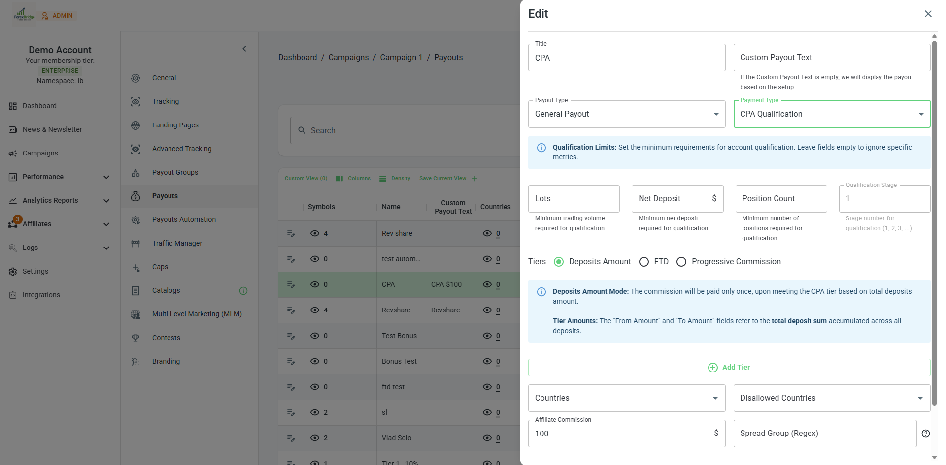 CPA Qualification payouts are a specialized payout structure that allows you to define multiple conditions a referred client must meet before an affiliate/IB becomes eligible for the CPA commission. These conditions include requirements such as a minimum number of lots traded, a minimum deposit amount, or a minimum number of positions opened.