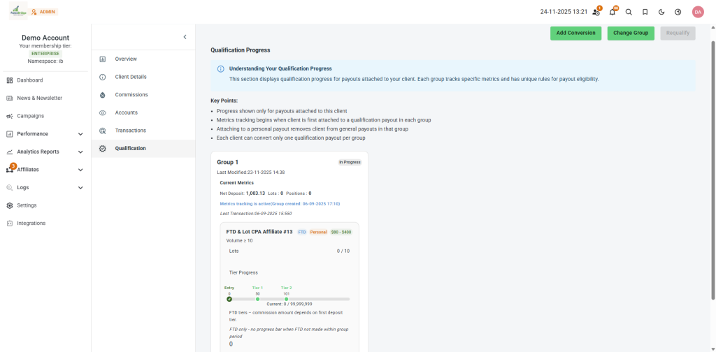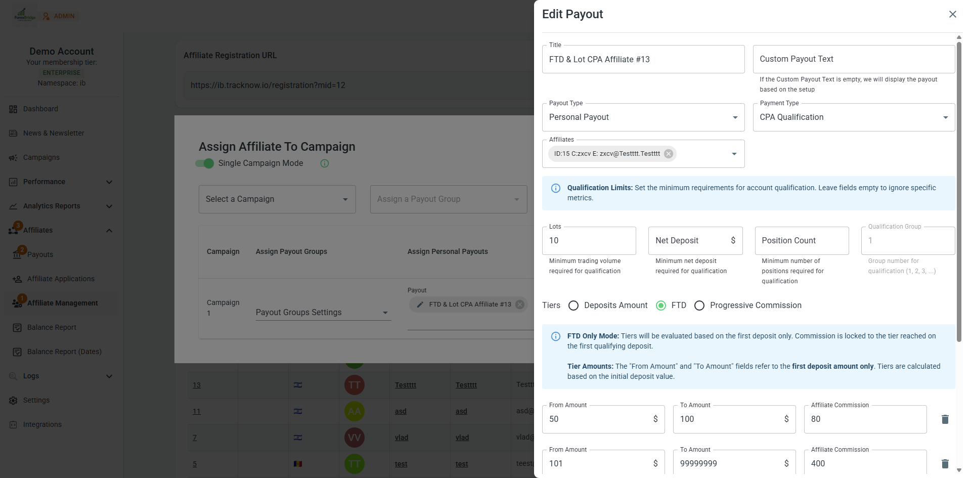 When a new affiliate/IB is onboarded, you can configure their CPA Qualification payout.