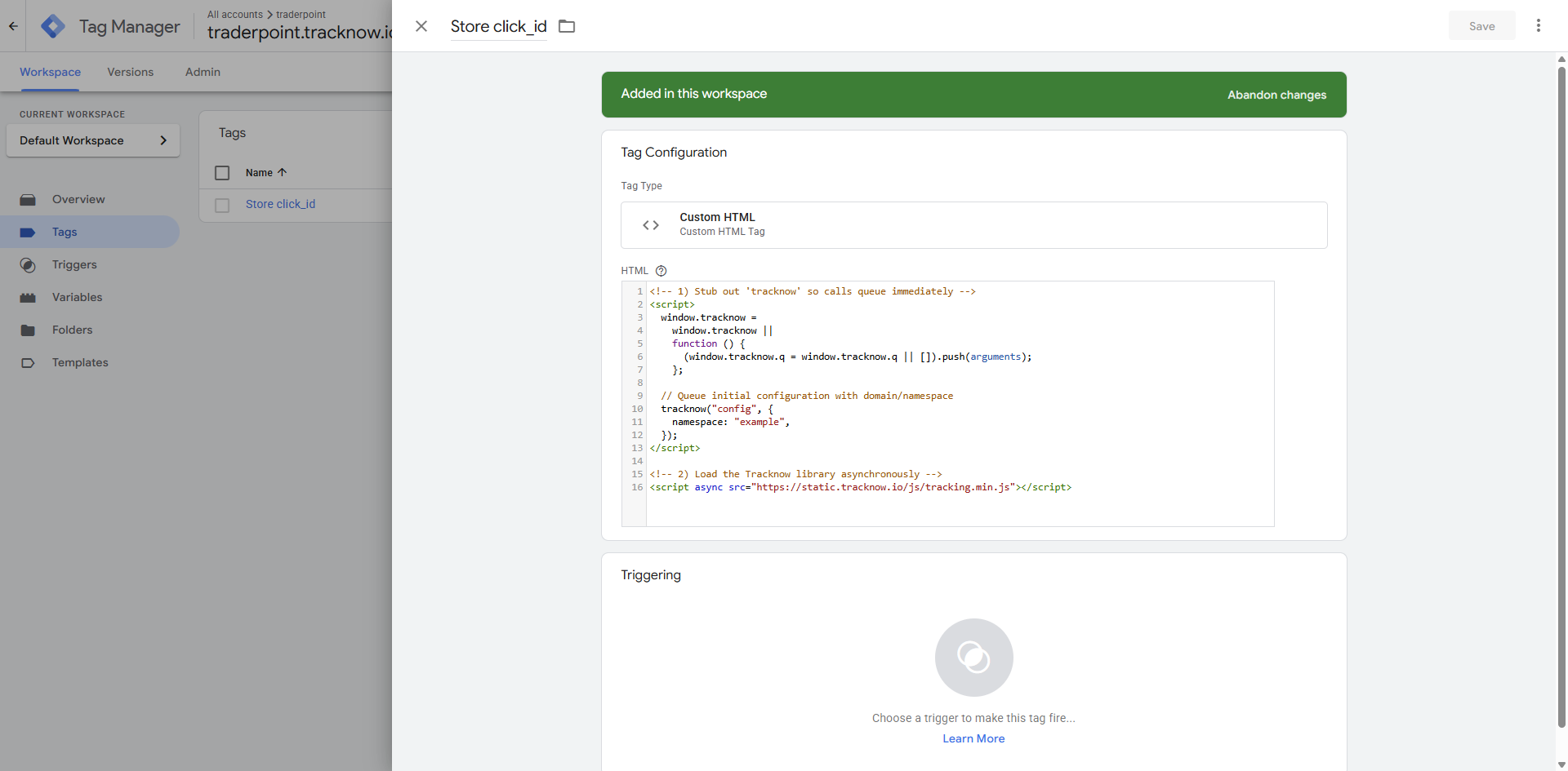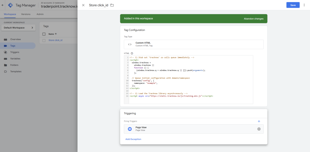 Copy the code above, replace the ENTER YOUR NAMESPACE HERE placeholder with your actual Tracknow namespace and paste the adjusted code in the GTM custom HTML code box.