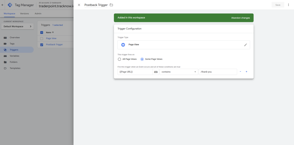 In GTM, create a new Page View trigger and set it to fire on Some Page Views. Then configure the condition so it fires only when the webstore’s Thank You page is viewed: set Variable to Page URL, choose Contains as the match type, and enter the Thank You page URL path (e.g., /thank-you).