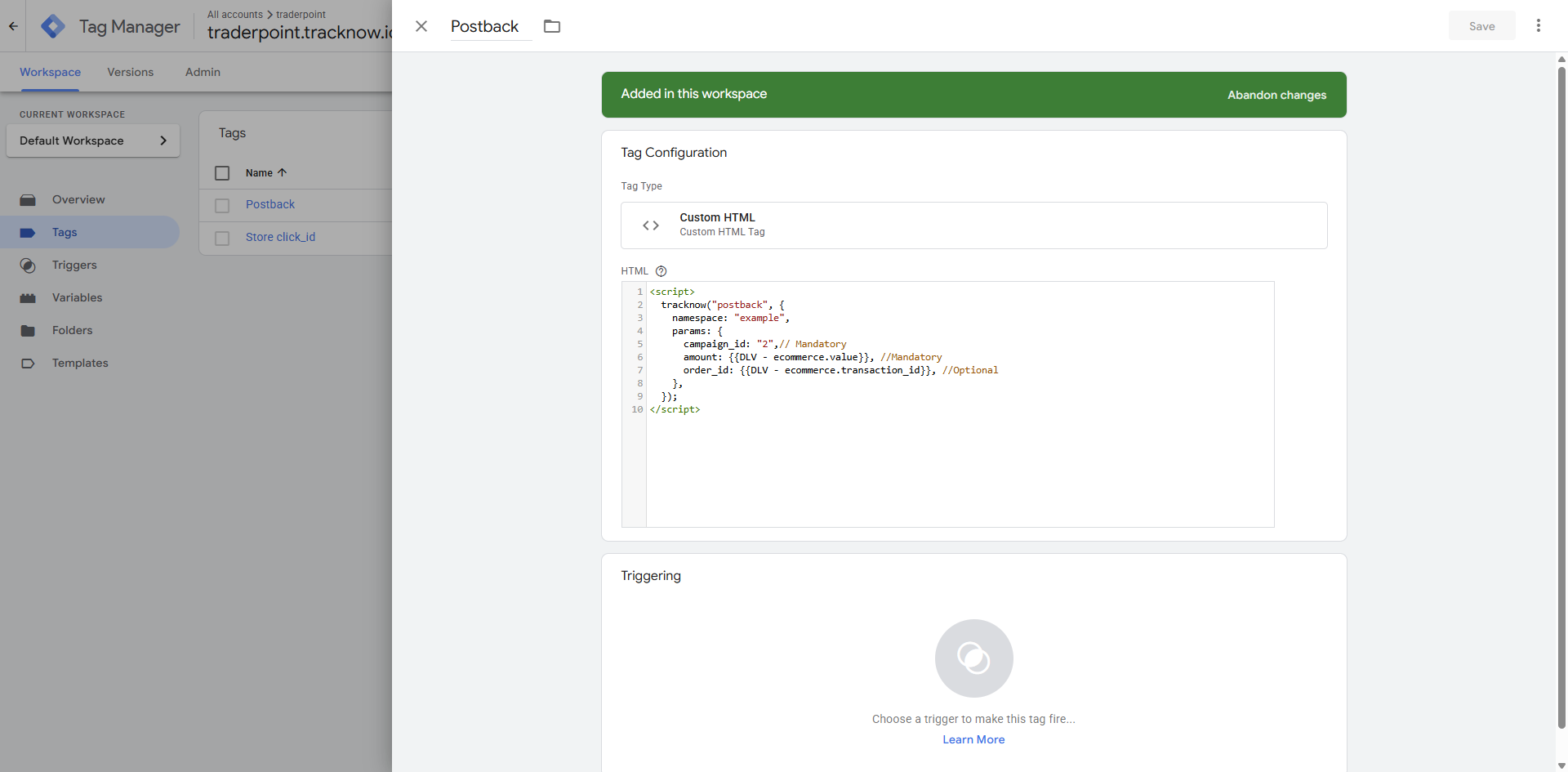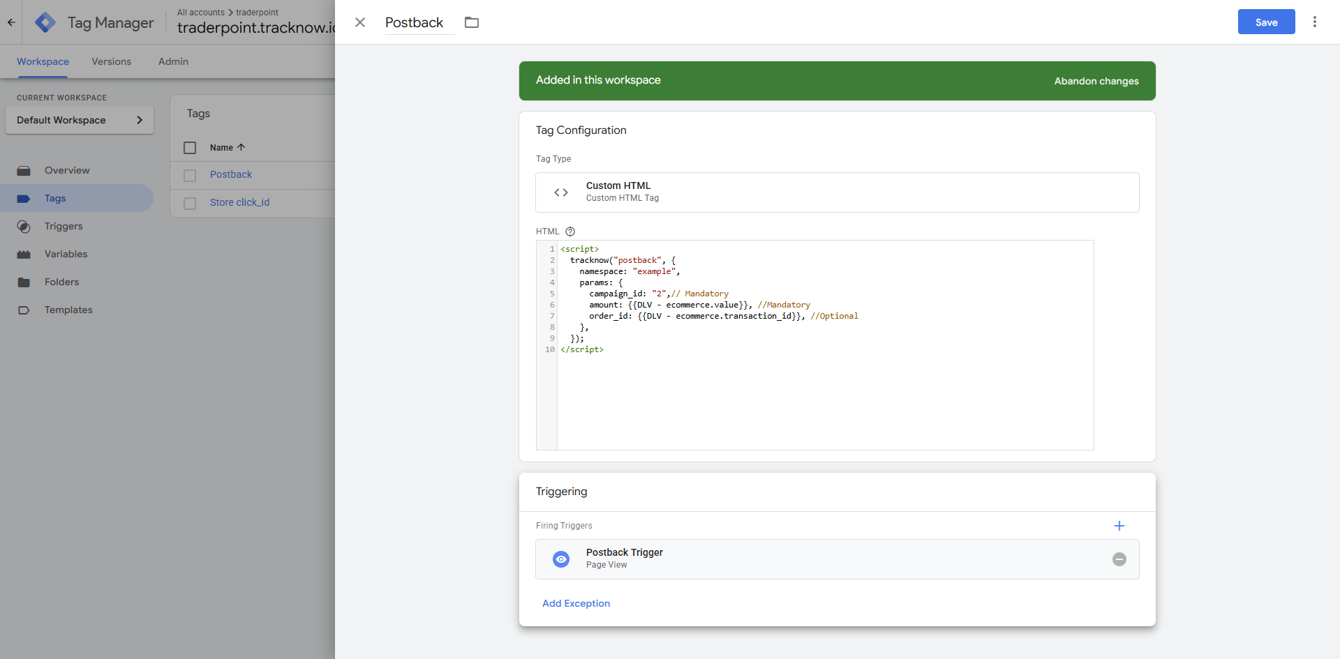 Next, you’ll need to add the script responsible for storing sending the postback.