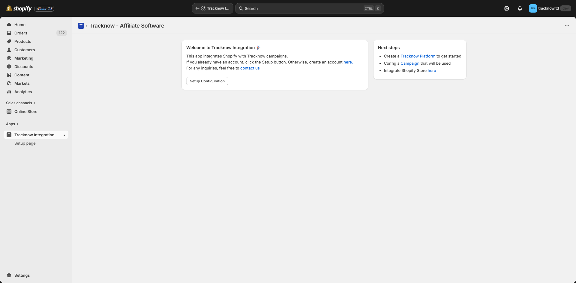 Navigate back to the Shopify dashboard → Open the Tracknow Integration app → Setup Configuration