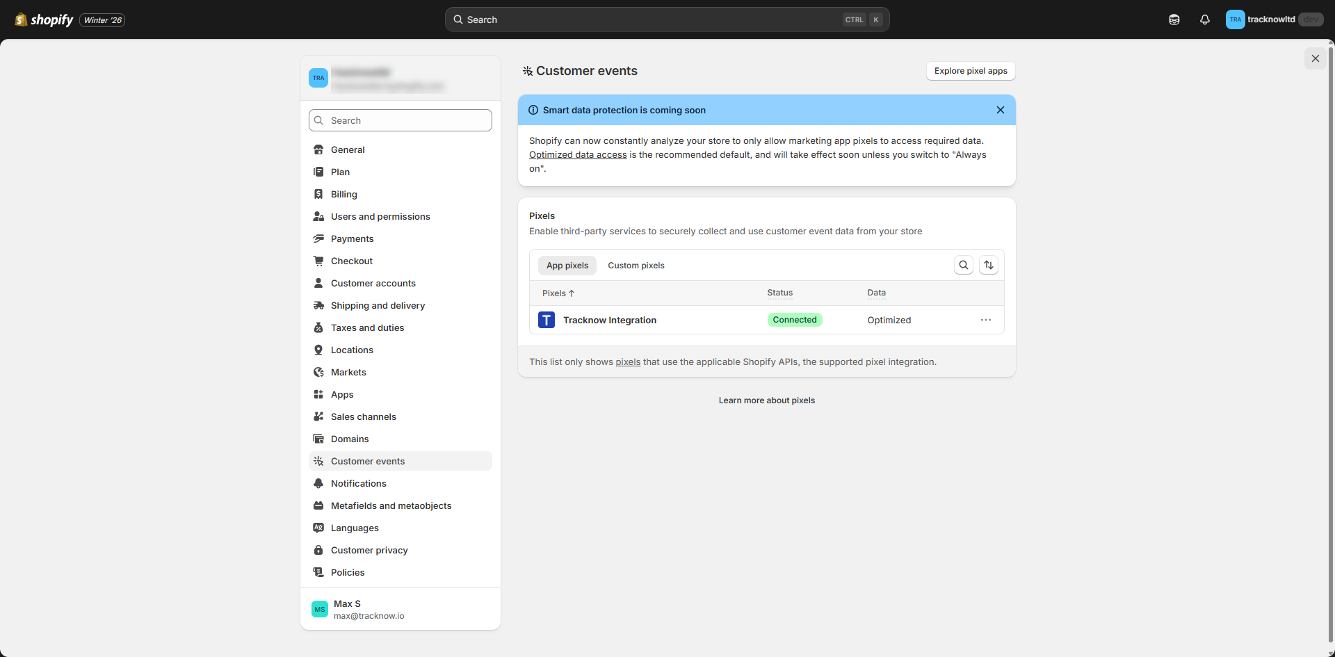 Navigate to Settings → Customer Events → Confirm that the plugin status is Connected