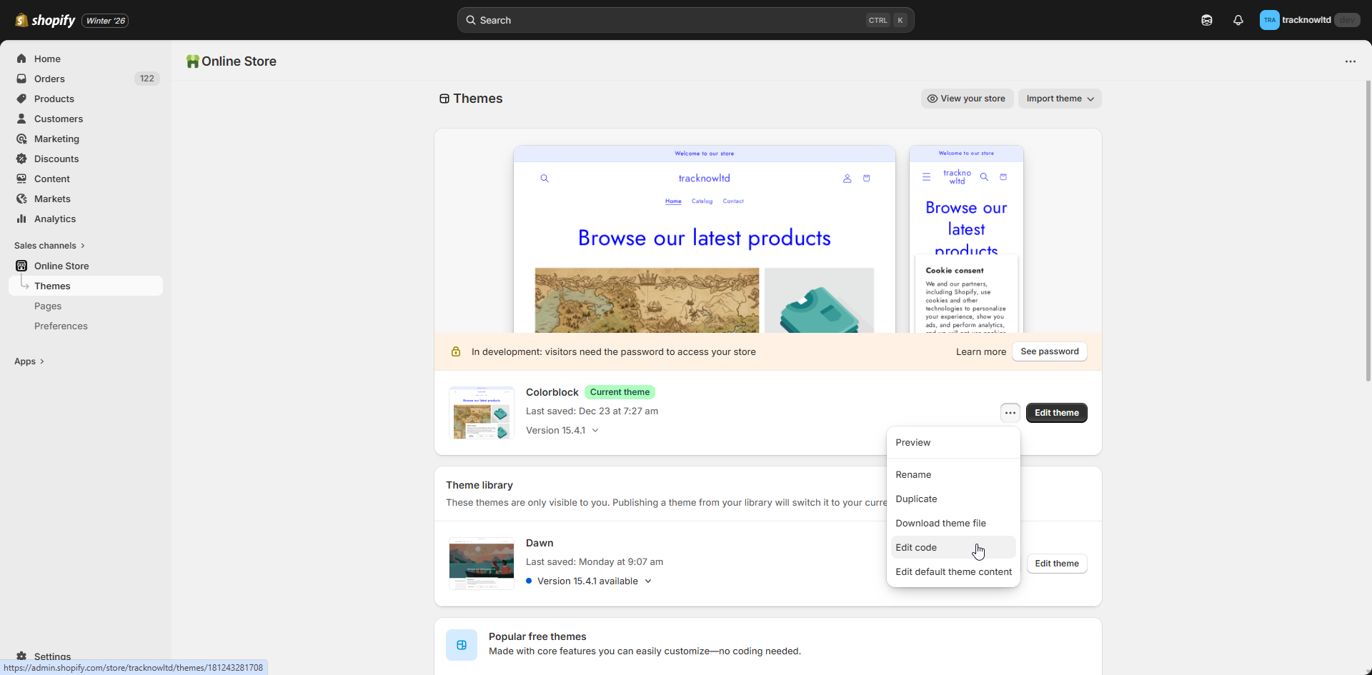Login to the Shopify admin dashboard → Online Store → Themes → Three-dot icon next to your Current Theme → Edit Code