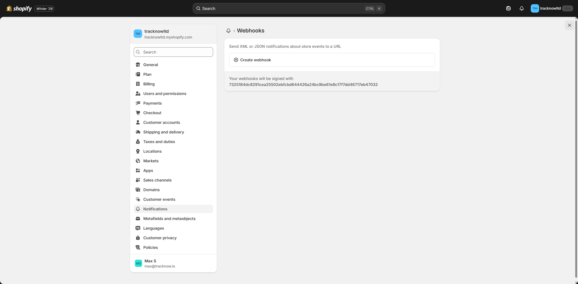 Navigate to Settings → Notifications → Webhooks → Create Webhook