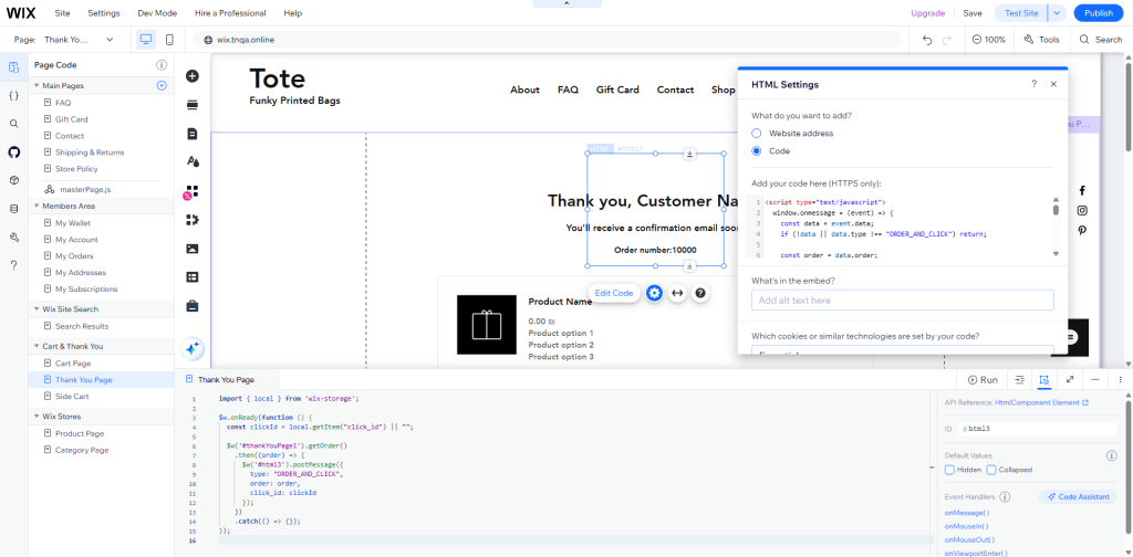 Add the following code to the Thank You Page code page and replace ‘thankYouPage1’ ID to the actual thank you page ID if it’s different and also replace embedded html id from “html3” to the ID Wix generated for that element.